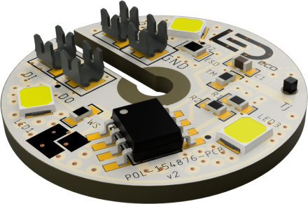 SPI Protokol je TM1814, Napájacie napätie modulu je 24VDC, (18-24VDC) ,SPI komunikácia zaberá spolu 4 kanály. Keďže 3 z 4 kanálov SPI IC ovláda vždy 1 LED, je možné aj v rámci LED modulu vytvoriť efekt rotácie alebo pohybu svetla (4.tý kanál sa nevyužíva). Každý kanál má vlastnú prúdovú stabilizáciu, čo aj veľmi pozitívne prispeje ku stabilite, a životnosti LED modulu. Modul je osadený v konfigurácii s 4x IDC7 AWG26/0.14mm2 konektorov, a teda má pre pripojenie káblov priamo samorezné konektory. Výkon modulu je 18mA na kanál (vysokonapaťová 18V LED), takže celkovo je výkon 0,432W / kanál, spolu 1,3W. Boost režim je možné nastaviť softwarovo na 200%) Modul obsahuje ESD ochranu na napájaní proti ESD prepätiu na vstupných napájacích vodičoch, dátové vstupy/výstupy obsahujú ochranu v prípade Hot-plug. LED modul je možné priprevniť mechanicky pomocou podložky z tepelne vodivej obojstrannej pásky, alebo pomocou skrutky M3 s hlavičkou dia max. 6mm v strede. Výrez v PCB z boku smerom do stredu umožňuje inštaláciu LED modulu na el. kábel alebo oceľové lanko napr. idúce stredom, prípadne kedykoľvek demontáž a montáž na miesto i v hotovom zapojení.