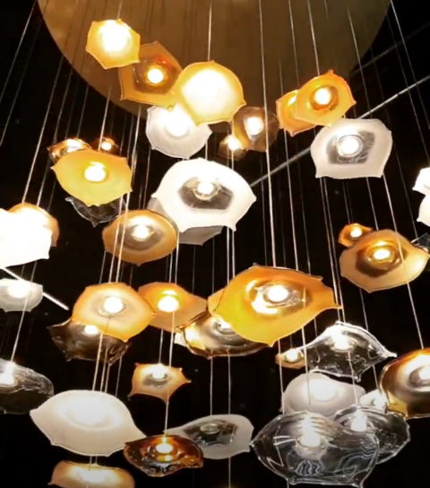 A seemingly infinite luminaire mastered to its last piece with handmade floating glass chips, that hang on optic fibres powered purely by LED, circle.