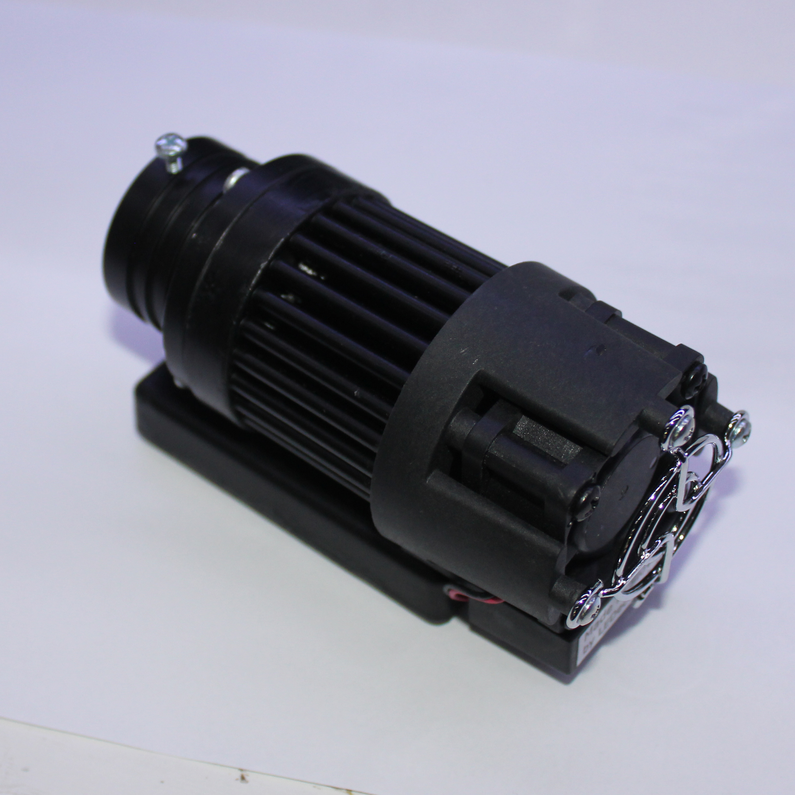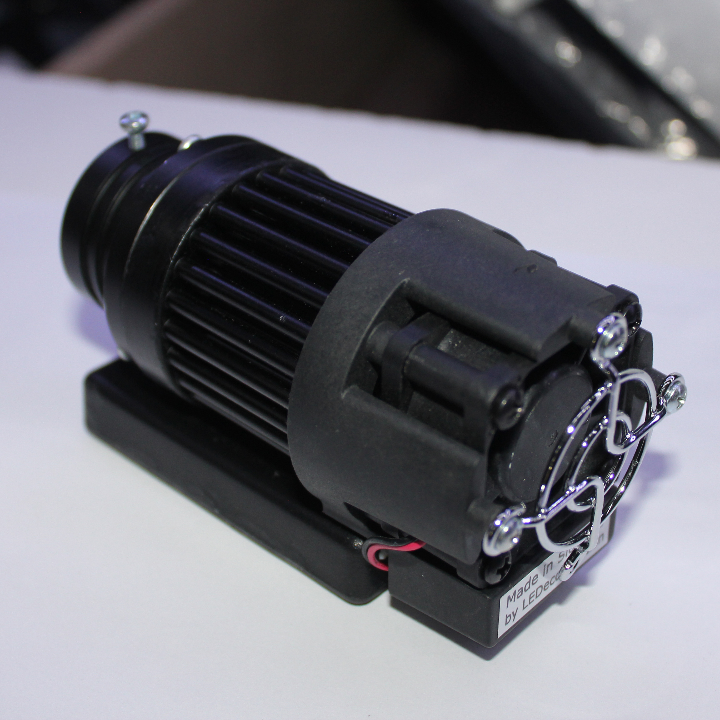Aktívne chladený výkonový iluminátor s farbou svetla studená biela, pre veľmi vysoké intenzity. Použitie je vhodné pre optické vlakna sideglow, endglow, atď, kde je vyžadovaná vysoká intenzita svetla z jedného iluminátora. Chladenie je aktívne a regulované mikrokontrolérom, s tepelnou hranicou 48C, kedy po prekročení tejto teploty sa automaticky vypne a vychladí. Nábeh po zapnutí je pomalý, plynulý. Pozor, optické vlákna musia byť veľmi precízne zaleštené v porte, inak hrozí roztavenie vlákien vplyvom vysokej intenzity svetla. Pozo! nikdy nepozerajte do svetla iluminátora v zapnutom stave - hrozí poškodenie očí. Iluminátor vyžaduje stabilné 24VDC napätie pre chladiacu a ochrannú elektroniku, pričom jednotlivé kanály sú napájané a ovládané samostatnými vstupnými svorkami, pripojené na štandardné 24VDC napäťové PWM kontroléry pre ovládanie regulácie jasu jednotlivých kanálov.