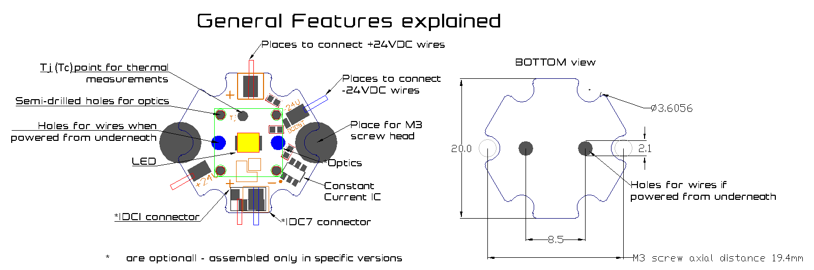 LED modul s 18V Vf LED na STAR HEX,4000K,IDC1 double AWG28,CC driver 20/45mA, 24VDC,ESD