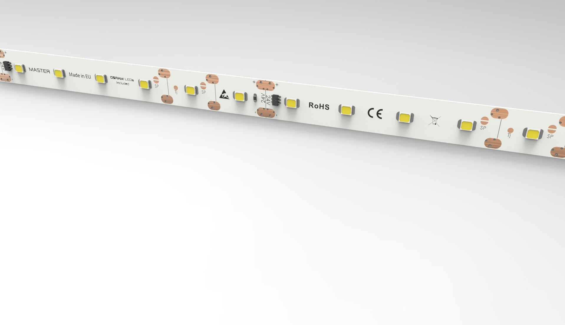 | Doplnkové funkcie / Vylepšenia Vylepšenia a funkcie sú asi najväčší zdroj inovácii a detailov, ktorý Vám dokáže uľahčiť montáž alebo predĺžiť životnosť. | Inštalácia nalepením, Negatívny teplotný koeficient, Skrátenie sekcie LED Pásu, Skracovacie pady, Príprava na SYSCON, Prúdové drivre (CC IC), ESD ochrana |