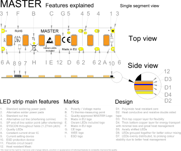 | Doplnkové funkcie / Vylepšenia Vylepšenia a funkcie sú asi najväčší zdroj inovácii a detailov, ktorý Vám dokáže uľahčiť montáž alebo predĺžiť životnosť. | Inštalácia nalepením, Negatívny teplotný koeficient, Skrátenie sekcie LED Pásu, Skracovacie pady, Príprava na SYSCON, Prúdové drivre (CC IC), ESD ochrana |