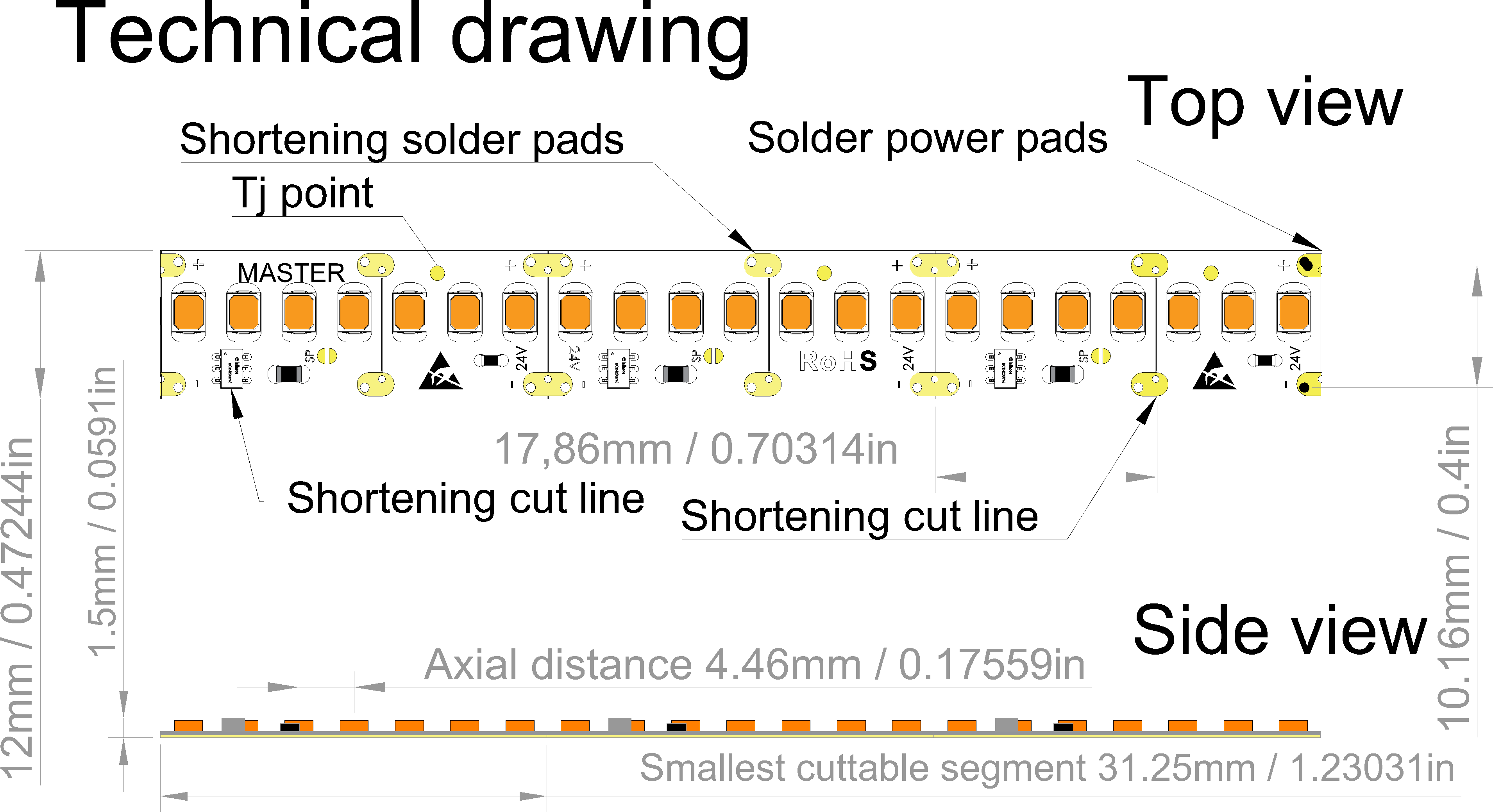 | Min.počet LED/sekciu po skrátení Väčšinu sekcií LED pásov MASTER je možné skrátiť na menší počet LED v sekcii. Tento parameter uvádza na aký min. počet LED v 1 segemente je možné skrátenie realizovať (nutné preletovať kvapkou cínu najbližši bod SP). Pozor-daná sekcia bude mať iné Umin. | 4 |