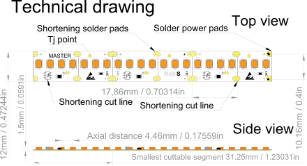 | Deliteľnosť / Dĺžka sekcie Deliteľnosť LED pásu ovplivňuje prácu s ním ako aj rôzne iné detaily. Pre krátke línie kde je potreba presného prispôsobenia konkrétnej dĺžke (nábytkové osvetlenie) používajte sériu HD (High Density = veľmi husté a teda veľmi malá deliteľnosť. | 31,25 mm |