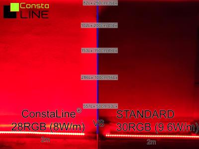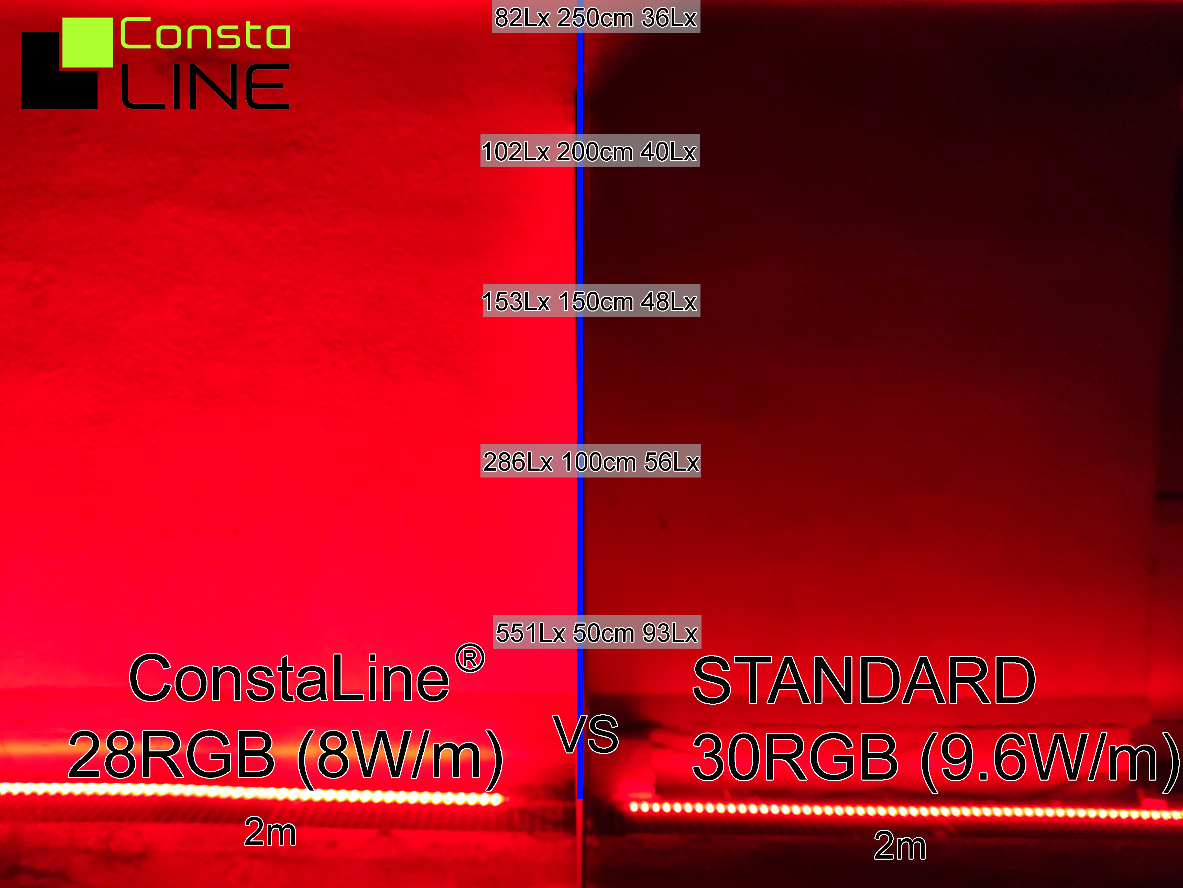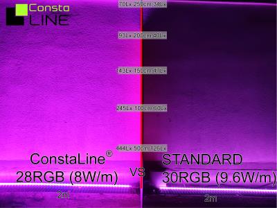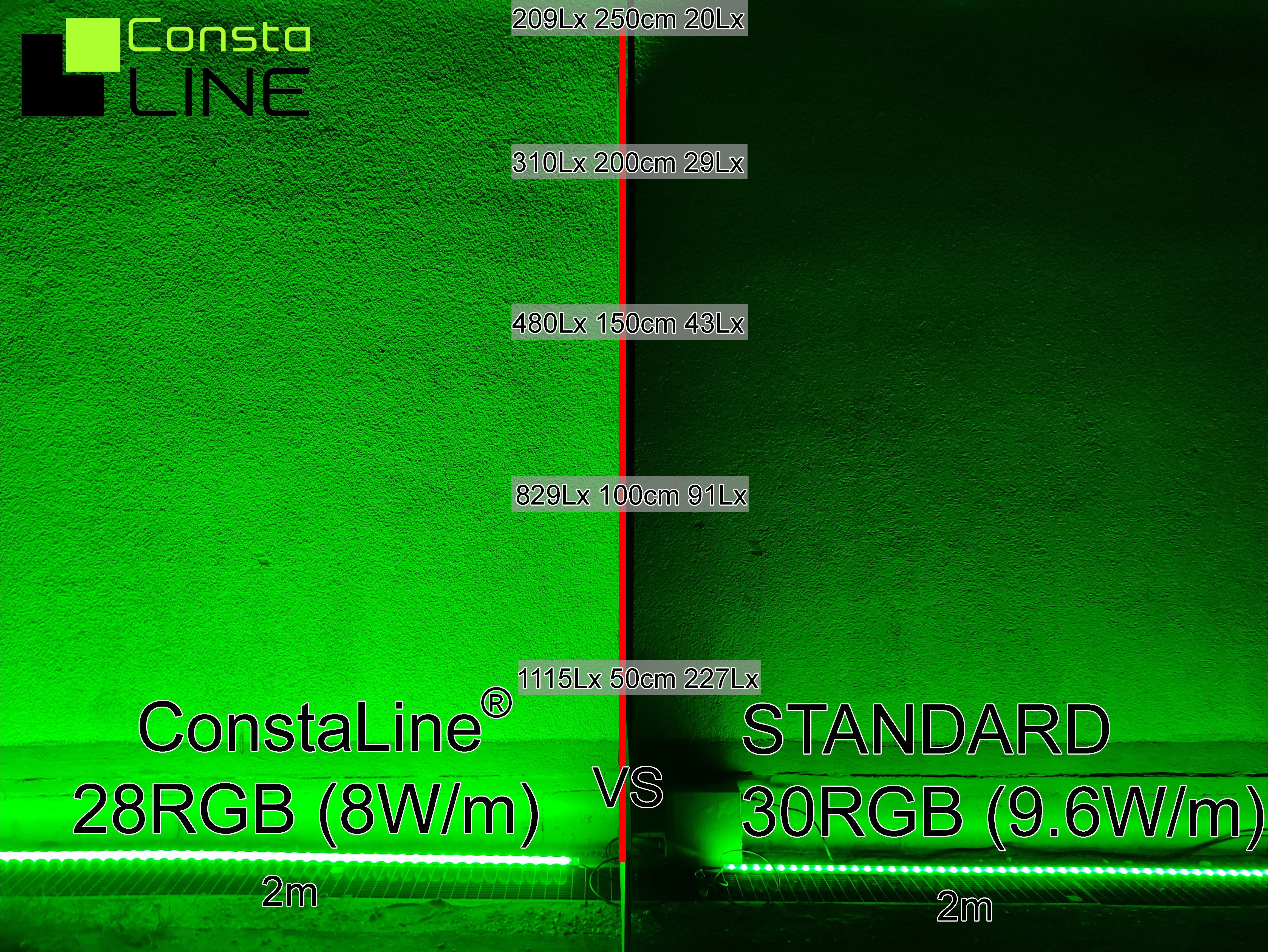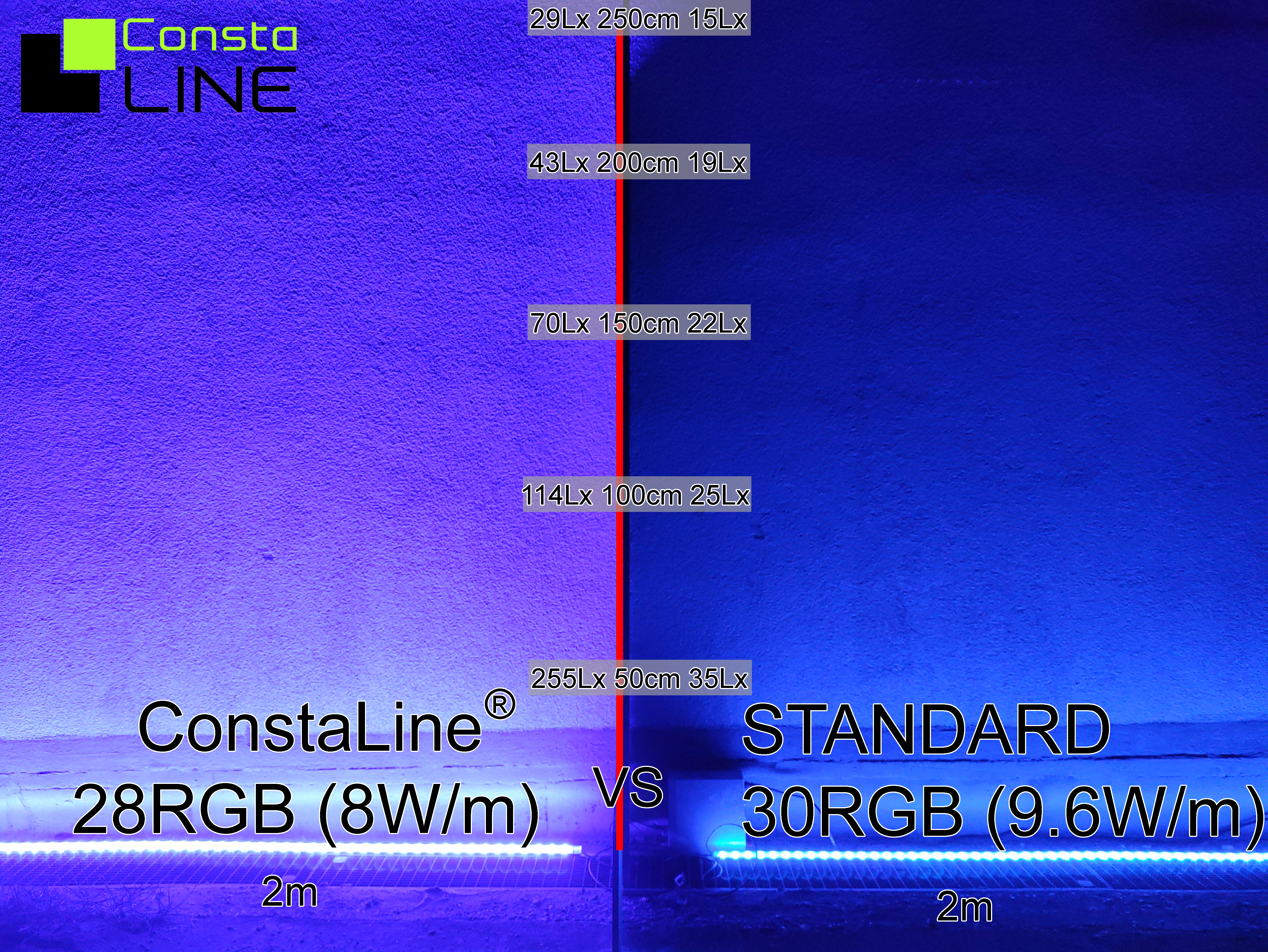 Prúdové drivre stabilizujú podmienky pre všetky LED čipy na páse identicky, či sú na začiatku línie, alebo na konci, čo má za následok krásnu homogenitu farieb po celej dĺžke. Keďže prúdové drivre sú integrované na páse, tento LED pás je možné pripojiť už priamo na 24VDC systém.CONSTALINE systém znamená že výkon LED Pásu je vždy rovnaký či svietite iba 1farbou, alebo zmiešavate 2 či 3 farby v ľubovoľnompomere. Toto umožňuje LED pásu efektívne využívať primaŕnu farbu na maximum, kdežte keď dode ku zmiešavaniu farieb, môžete si byť istý že LED pás sa nebude 3x viac hriať ani nebude 3 x viac prúdu odoberať - toto je veľmi vhodné pre napr. DALI systémy, alebo DMX512 systémy, kde nieje potreba predimenzovať napájaciu sústavu aby zniesla maximálny výkon všetkých 3 či 4 kanálov (i keď ho nebudete určite na také kombinácie používať) Uvítajú to hlavne profesionáli snažiaci sa o kvalitné osvetlenie prietsoru bez toho aby museli predimenzovať všetko 3-4. násobne ako býva zvykom pri bežných RGB / RGBW systémoch.