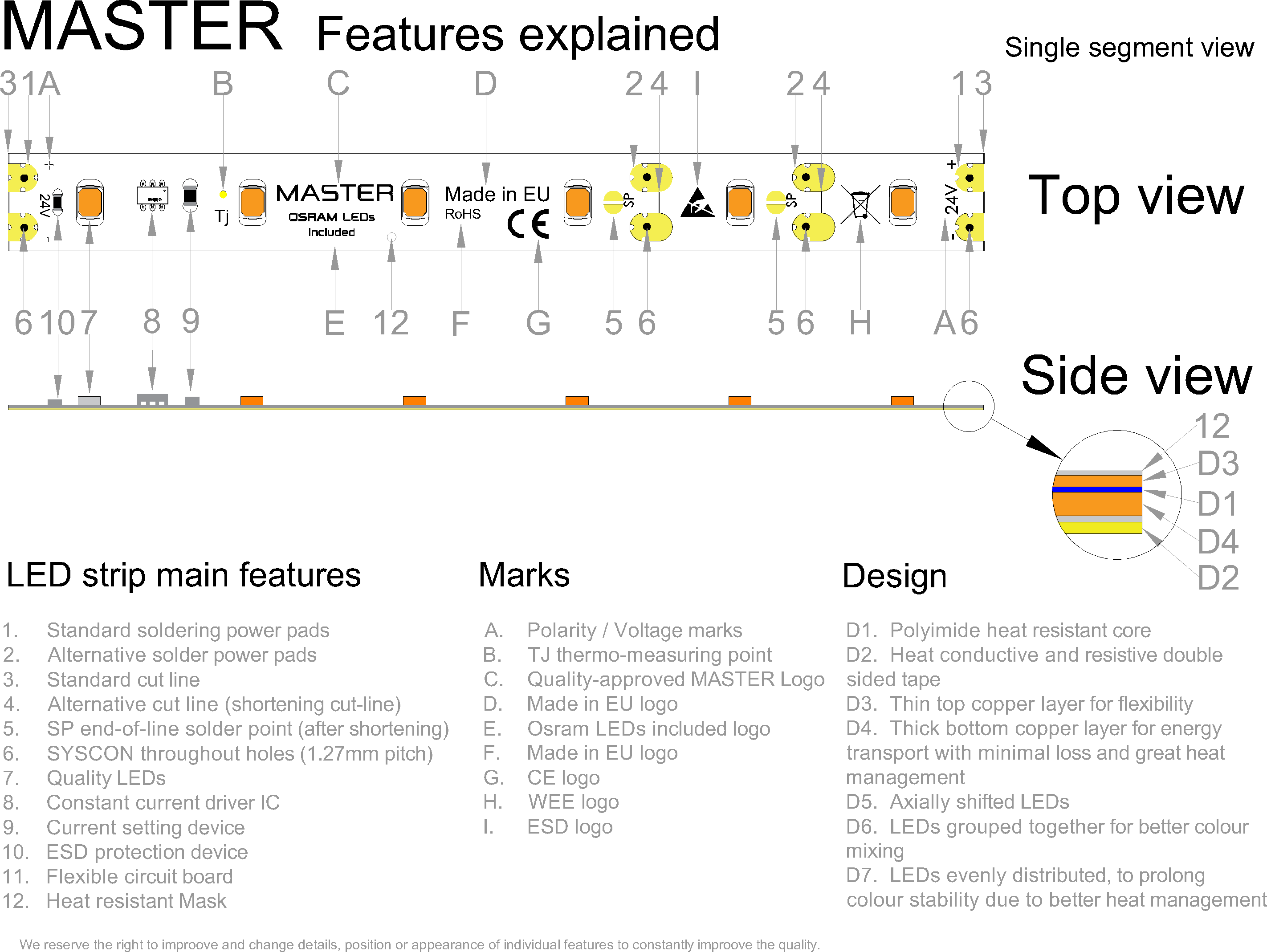 | Doplnkové funkcie / Vylepšenia Vylepšenia a funkcie sú asi najväčší zdroj inovácii a detailov, ktorý Vám dokáže uľahčiť montáž alebo predĺžiť životnosť. | Inštalácia nalepením, Negatívny teplotný koeficient, Skrátenie sekcie LED Pásu, Skracovacie pady, Príprava na SYSCON, Prúdové drivre (CC IC), ESD ochrana |