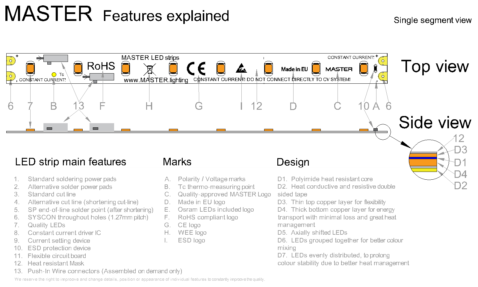 | Max. prevádzková teplota Tc(max) MAXIMALNA teplota meraná zväčša na Tj/Tc bode. V prípade MASTER pasov to je ustálená prevádzková teplota na Tj/Tc bode LED pásu bez akéhokoľvek dodatočného chladiaceho média (ALU profilu) voľne položený na stole pri ambientnej teplote Ta=25°C. | 40 °C |