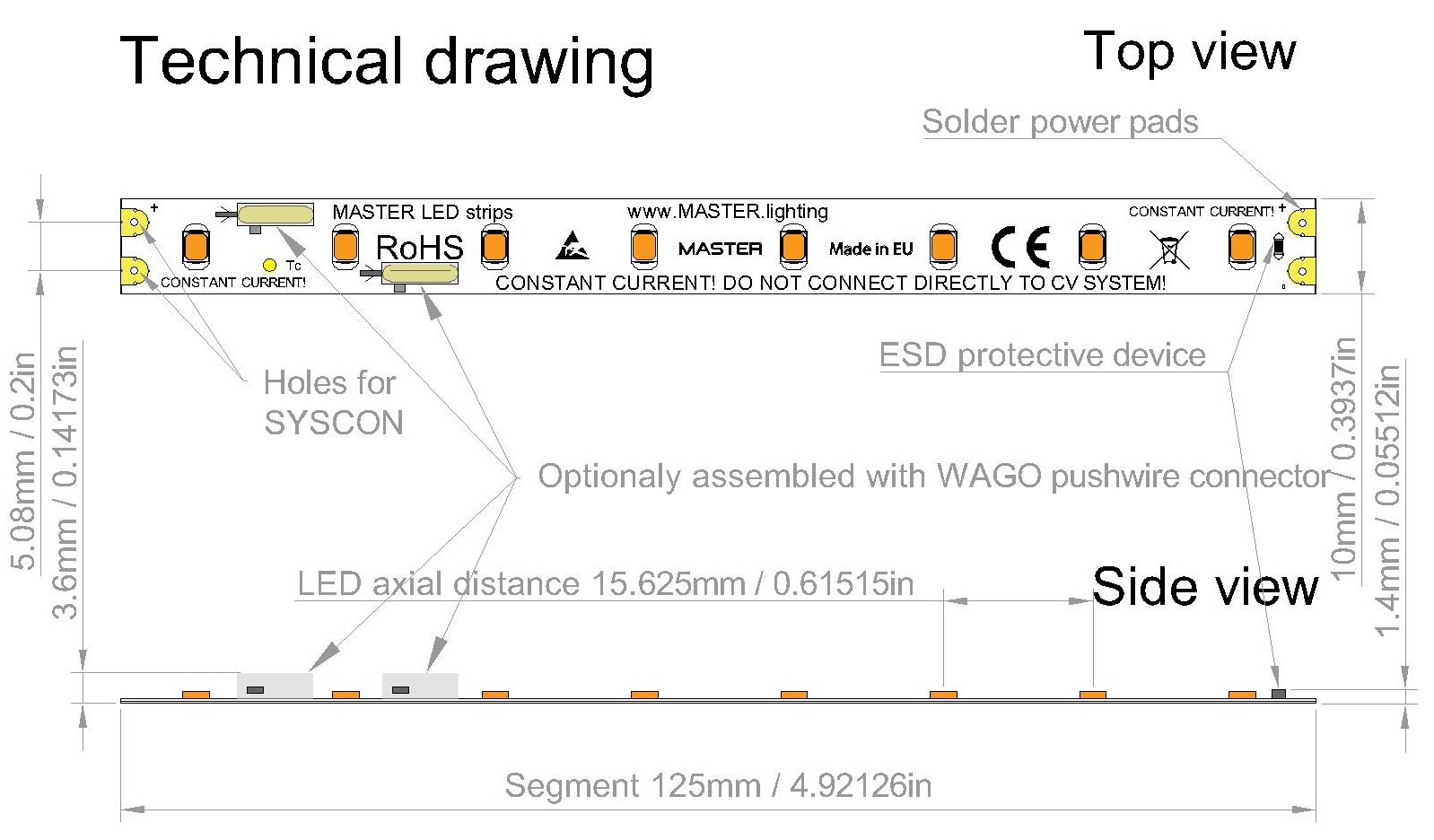 | Deliteľnosť / Dĺžka sekcie Deliteľnosť LED pásu ovplivňuje prácu s ním ako aj rôzne iné detaily. Pre krátke línie kde je potreba presného prispôsobenia konkrétnej dĺžke (nábytkové osvetlenie) používajte sériu HD (High Density = veľmi husté a teda veľmi malá deliteľnosť. | 125 mm |