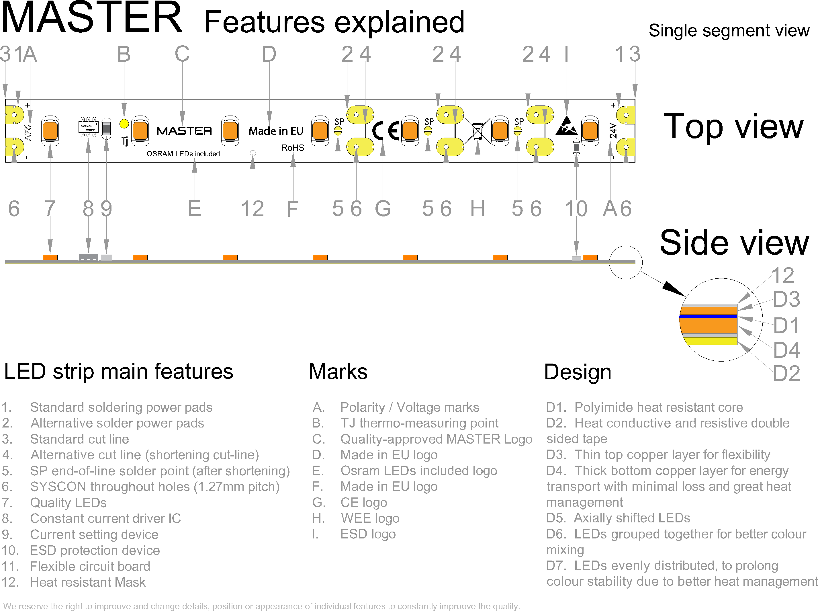 | Doplnkové funkcie / Vylepšenia Vylepšenia a funkcie sú asi najväčší zdroj inovácii a detailov, ktorý Vám dokáže uľahčiť montáž alebo predĺžiť životnosť. | Inštalácia nalepením, Negatívny teplotný koeficient, Skrátenie sekcie LED Pásu, Skracovacie pady, Príprava na SYSCON, Prúdové drivre (CC IC), ESD ochrana |