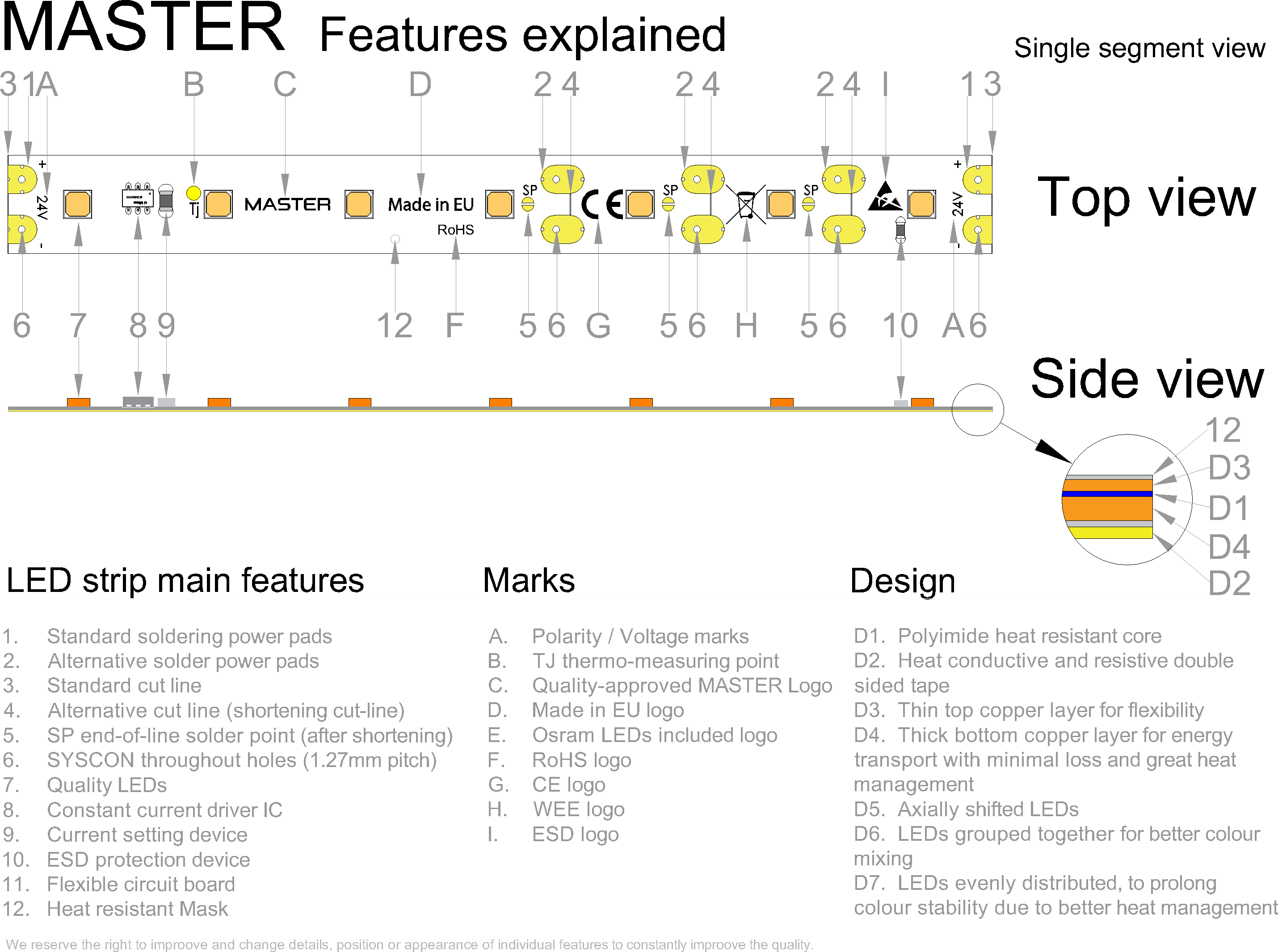 | Doplnkové funkcie / Vylepšenia Vylepšenia a funkcie sú asi najväčší zdroj inovácii a detailov, ktorý Vám dokáže uľahčiť montáž alebo predĺžiť životnosť. | Inštalácia nalepením, Negatívny teplotný koeficient, Skrátenie sekcie LED Pásu, Skracovacie pady, Príprava na SYSCON, Prúdové drivre (CC IC), ESD ochrana |