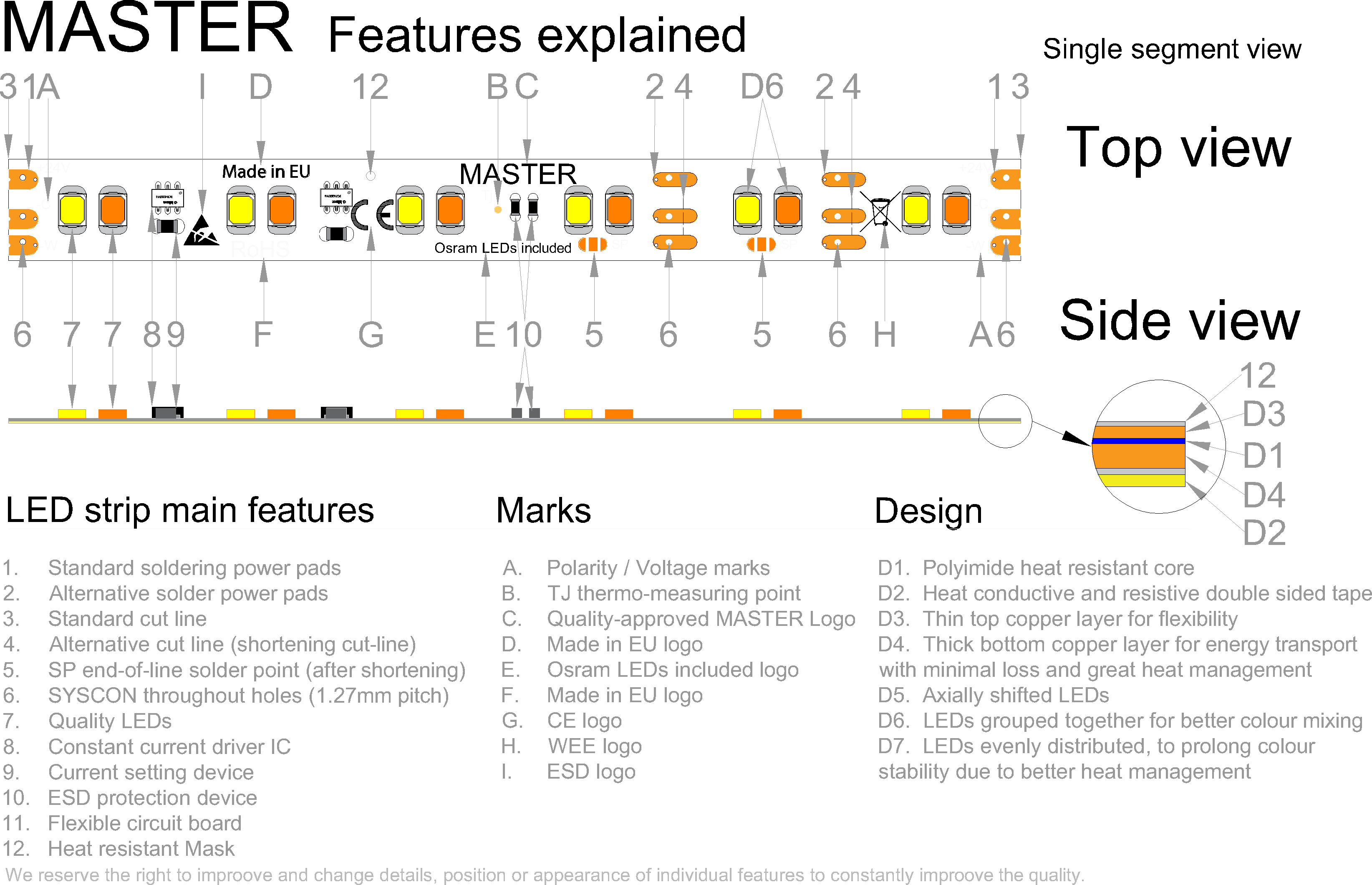 | Doplnkové funkcie / Vylepšenia Vylepšenia a funkcie sú asi najväčší zdroj inovácii a detailov, ktorý Vám dokáže uľahčiť montáž alebo predĺžiť životnosť. | Inštalácia nalepením, Negatívny teplotný koeficient, Skrátenie sekcie LED Pásu, Skracovacie pady, Príprava na SYSCON, Prúdové drivre (CC IC) |