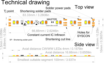 | Min.počet LED/sekciu po skrátení Väčšinu sekcií LED pásov MASTER je možné skrátiť na menší počet LED v sekcii. Tento parameter uvádza na aký min. počet LED v 1 segemente je možné skrátenie realizovať (nutné preletovať kvapkou cínu najbližši bod SP). Pozor-daná sekcia bude mať iné Umin. | 4 |