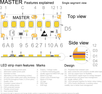 | Doplnkové funkcie / Vylepšenia Vylepšenia a funkcie sú asi najväčší zdroj inovácii a detailov, ktorý Vám dokáže uľahčiť montáž alebo predĺžiť životnosť. | Inštalácia nalepením, Negatívny teplotný koeficient, Skrátenie sekcie LED Pásu, Skracovacie pady, Príprava na SYSCON, Prúdové drivre (CC IC), ESD ochrana |