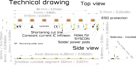 | Doplnkové funkcie / Vylepšenia Vylepšenia a funkcie sú asi najväčší zdroj inovácii a detailov, ktorý Vám dokáže uľahčiť montáž alebo predĺžiť životnosť. | Inštalácia nalepením, Negatívny teplotný koeficient, Skrátenie sekcie LED Pásu, Skracovacie pady, Príprava na SYSCON, Prúdové drivre (CC IC), ESD ochrana |
