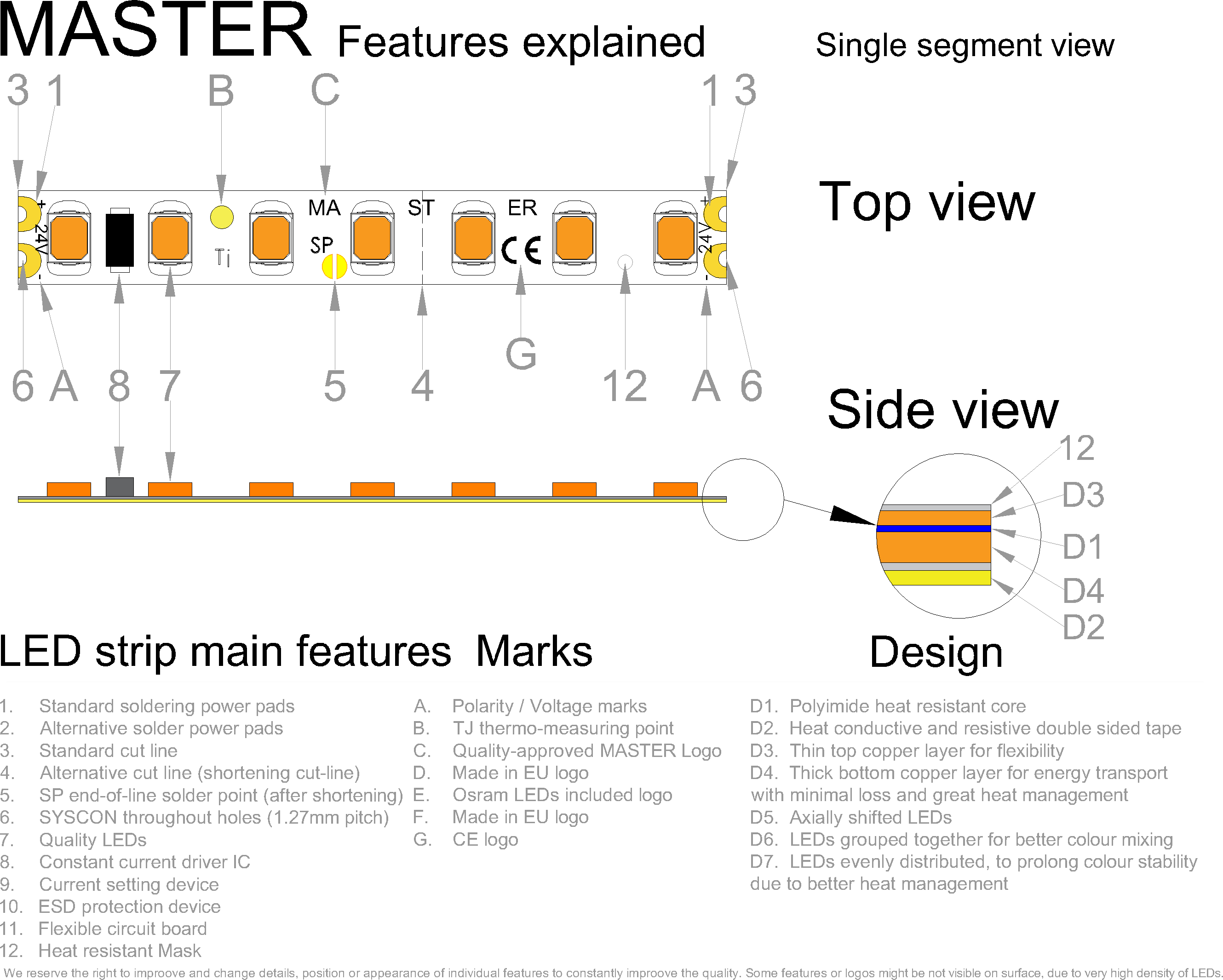 | Doplnkové funkcie / Vylepšenia Vylepšenia a funkcie sú asi najväčší zdroj inovácii a detailov, ktorý Vám dokáže uľahčiť montáž alebo predĺžiť životnosť. | Inštalácia nalepením, Negatívny teplotný koeficient, Skrátenie sekcie LED Pásu, Príprava na SYSCON, Prúdové drivre (CC IC) |