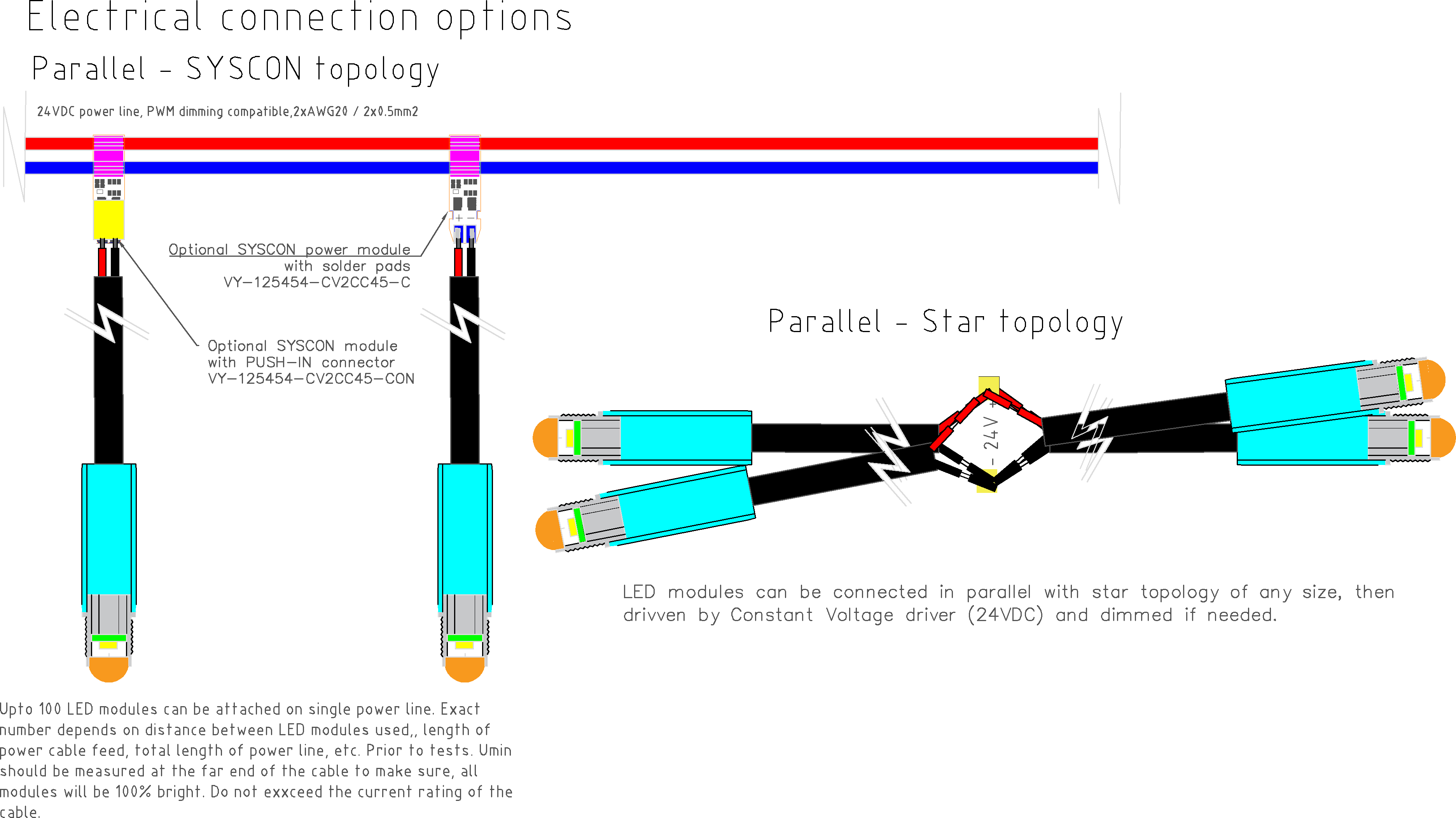 Dostupné sú aj iné prevedenia (prúdové s krátkym či dlhým prívodným káblom, 24VDC verzie s dlhým či krátkym káblom bez SYSCON/ so SYSCON konektorovým modulom, a iné.Pre stmievanie používajte kontroléry s PWM reguláciou. Pozor - Počas inštalácie a manipulácie majte vždy vypnuté napájacie napätie, zaistite správnu polaritu (zariadenie nieje odolné voči prepólovaniu) a zabezpečte, že pri práci nevznikne ESD statický náboj, ktorý môže zariadenie odpáliť. Zariadenie je vysoko citrlivé na ESD statický náboj.