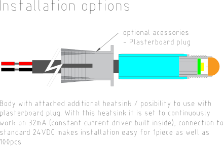 Miniatúrny LED iluminátor pre dekoračné osvetlenie pomocou optického vlákna, alebo pre vytvorenie efektu kryštálového neba pomocou kryštálových koncoviek a 300cm dlhým prívodným káblom, integrovaným prúdovým drivrom pre inštaláciu LED modulov na paralelnú priebežnú kabeláž a napájanie 24VDC napäťovým systémom. Svetlo je krásne sústredené pomocou optiky do malého miesta, a tak je efektívne nasmerované do vlákna alebo kryštálu. LED modul je potrebné inštalovať tak, aby bola jeho teplota pri prevádzke pod 50°C (nezakrývajte ho , umožnite cirkuláciou vzduchu okolo neho, atď) Pri použití kryštálovej koncovky je možné LED Modul inštalovať naskrutkovaním koncovky na M10x1 závit a následným zatlačením do nainštalovanej hmoždinky v materiále (súčasťou kryštálovej koncovky)
