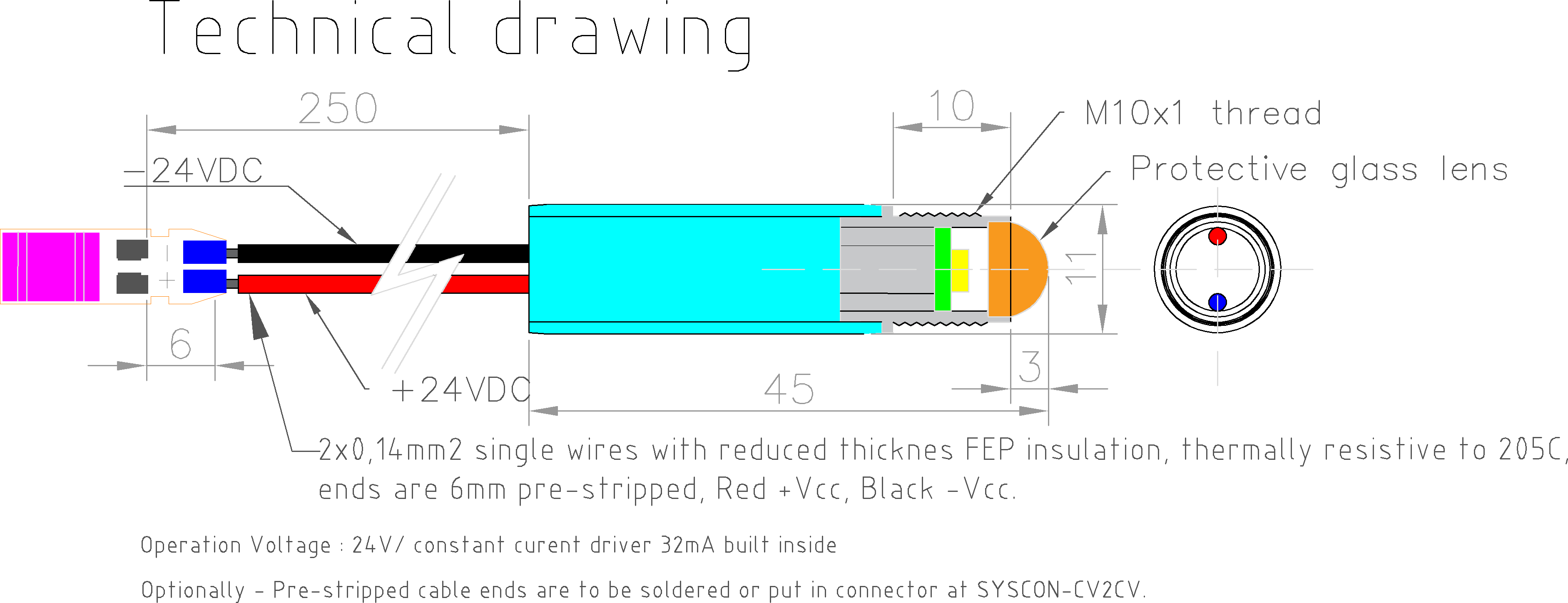 Miniatúrny LED iluminátor pre dekoračné osvetlenie pomocou optického vlákna, alebo pre vytvorenie efektu kryštálového neba pomocou kryštálových koncoviek a 25cm dlhým prívodným vodičom uončeným SYSCON CV2CV modulom, pre inštaláciu LED modulov na paralelnú priebežnú kabeláž s prierezom AWG20 (lanková dvojlinka 2x0.5mm2) a napájanie 24VDC napäťovým systémom. Svetlo je krásne sústredené pomocou optiky do malého miesta, a tak je efektívne nasmerované do vlákna alebo kryštálu. LED Moduly je možné veľmi efektívne a profesionálne hromadne inštalovať použitím SYSCON CV2CV konektorového modulu (súčasťou) s IDC2 samoreznými konektormi pre rýchlu inštaláciu káblov do konektoru jednoduchým zatlačením (konektory majú samorezné čeluste a prerežu sa cez izoláciou až ku medenému jadru vodiča, čim nastane perfektný spoj, bez nutnosti fyzického rozdelenia a pracného spájania káblov. Pri použití kryštálovej koncovky je možné LED Modul inštalovať naskrutkovaním koncovky na M10x1 závit a následným zatlačením do nainštalovanej hmoždinky v materiále (súčasťou kryštálovej koncovky)