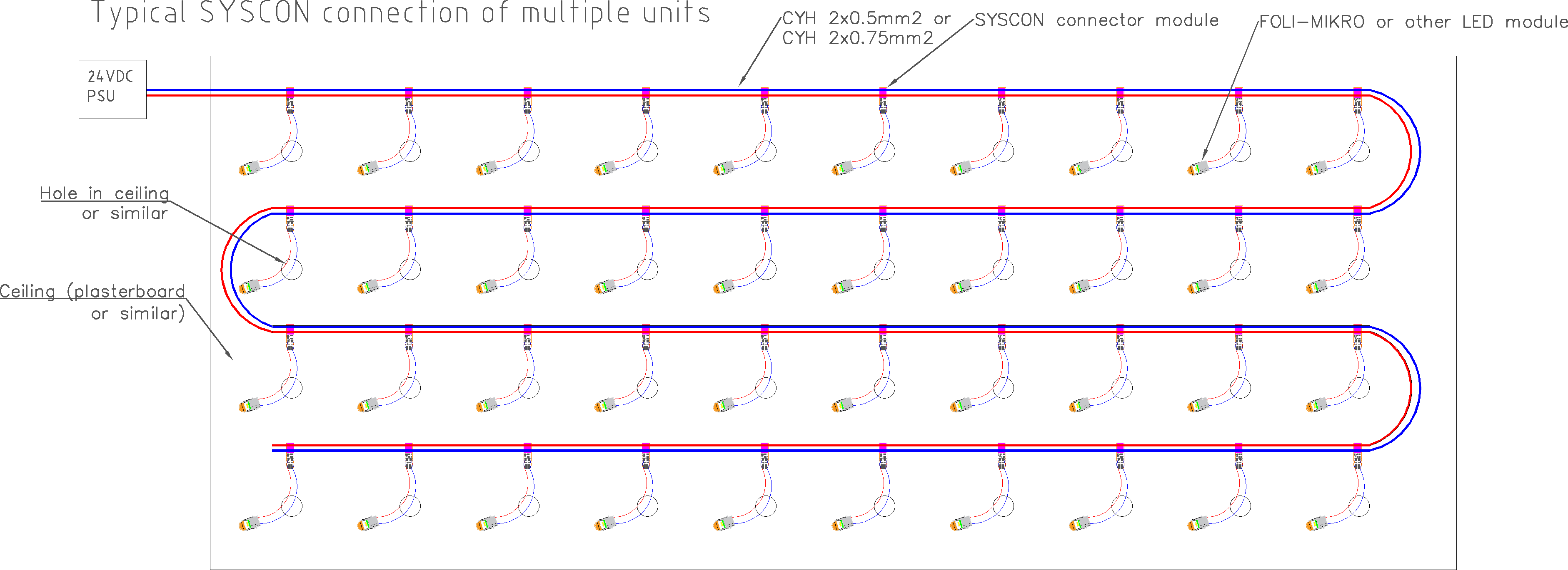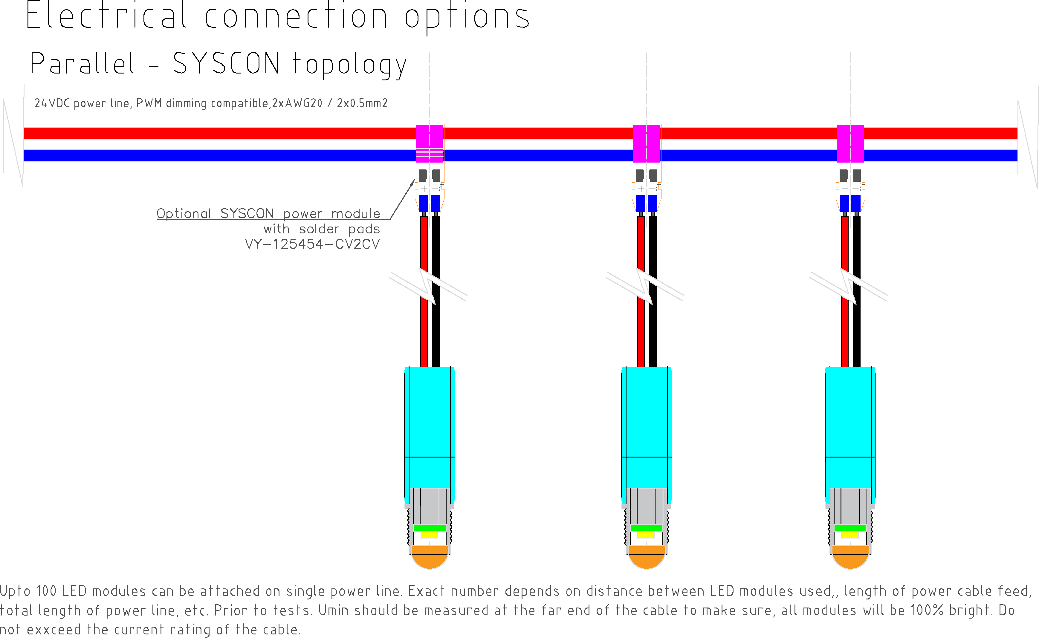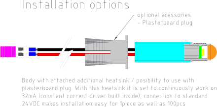 Miniatúrny LED iluminátor pre dekoračné osvetlenie pomocou optického vlákna, alebo pre vytvorenie efektu kryštálového neba pomocou kryštálových koncoviek a 25cm dlhým prívodným vodičom uončeným SYSCON CV2CV modulom, pre inštaláciu LED modulov na paralelnú priebežnú kabeláž s prierezom AWG20 (lanková dvojlinka 2x0.5mm2) a napájanie 24VDC napäťovým systémom. Svetlo je krásne sústredené pomocou optiky do malého miesta, a tak je efektívne nasmerované do vlákna alebo kryštálu. LED Moduly je možné veľmi efektívne a profesionálne hromadne inštalovať použitím SYSCON CV2CV konektorového modulu (súčasťou) s IDC2 samoreznými konektormi pre rýchlu inštaláciu káblov do konektoru jednoduchým zatlačením (konektory majú samorezné čeluste a prerežu sa cez izoláciou až ku medenému jadru vodiča, čim nastane perfektný spoj, bez nutnosti fyzického rozdelenia a pracného spájania káblov. Pri použití kryštálovej koncovky je možné LED Modul inštalovať naskrutkovaním koncovky na M10x1 závit a následným zatlačením do nainštalovanej hmoždinky v materiále (súčasťou kryštálovej koncovky)