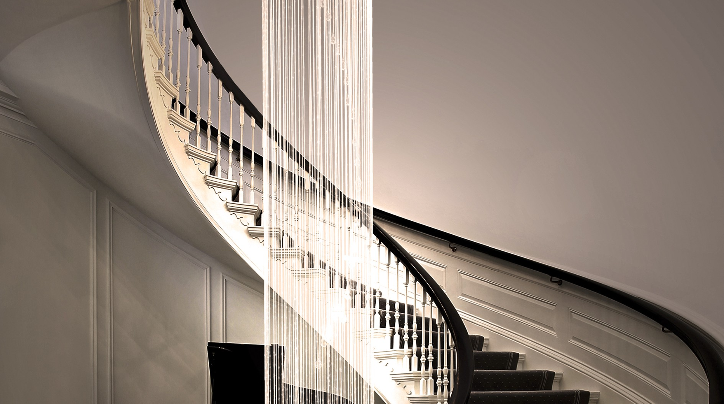 A majestic luminaire to visually interconnect floors, high ceilings or spacious foyers. It is made purely from sparkling optic fibres with inner circle of glass crystals shaped into a cascade. This marvellous pillar is a perfect fit for reception areas, entry halls or to "climb" up two or more storeys of your building.