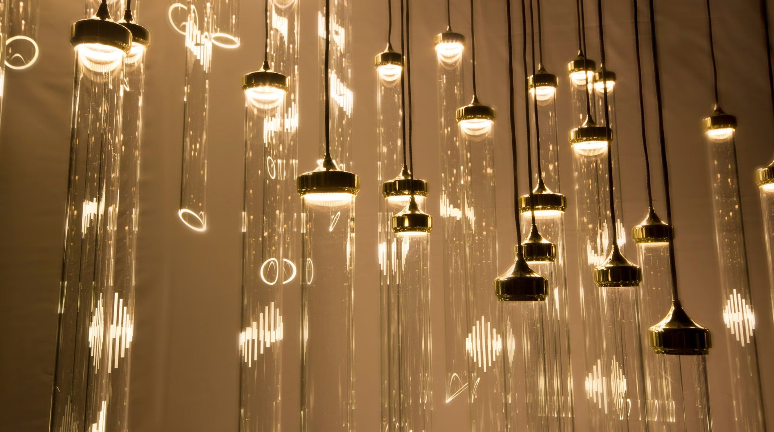 Versatile SOLINA design is based on hand crafted glass tubes in a diameter of 30 and 40mm with sandblasted patterns and the angle-cut bottom piece. Individual LED modules come in fittings made of brass with galvanic surface treatment (gold finish as a standard). These hang on thin electrical wires with braided surface enhancing its playful design with a nice texture touch to it (black as a standard). This chandelier has been designed for baseless situations as a standard but you can enquire a surface or recessed fitted base.