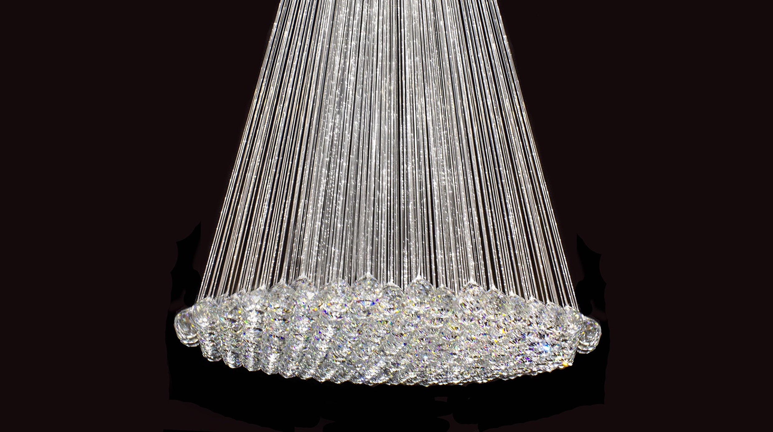 This superior chandelier is intended for high-ceiling rooms, hallways or for the reception areas. The chandelier is made from thin optic fibres which sparkle all the way to the crystal end fittings whilst the light is mastered by our LED light source. Its timeless design will proudly enlighten any large staircase or a spacious area in search for a dominant piece. Delivered as a surface mounted version, for SWAROVSKI version please enquire within.