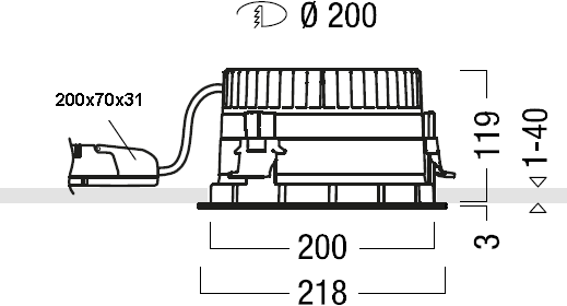 | Montažny otvor Rozmer montážneho otvoru v prípade že je svietidlo zapustené | 200 mm |